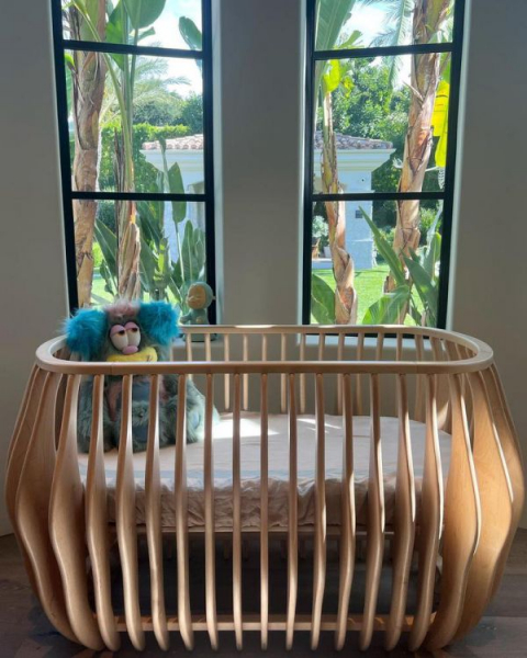Зірка показала ліжечко для малюка, яке виконане із стильних дерев’яних панелей. Кардаш’ян розповіла, що її вартість становить 10 000 доларів. І перший друг для дитини вже теж готовий, а саме – пухнастий м’який синій монстр. Дороге ліжечко стоїть перед двома великими вікнами, що виходять на пишний зелений сад їхнього маєтку в Каліфорнії.