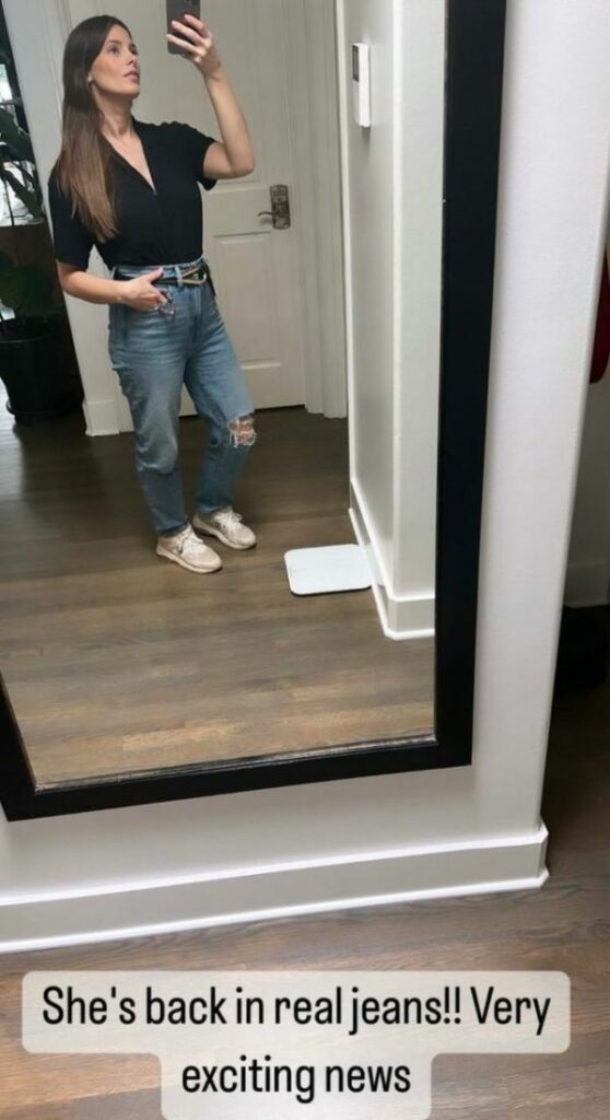 А напередодні Ешлі показала, як виглядає через тиждень після пологів. Акторка виклала у соціальних мережах знімок, на якому позувала у чорній футболці з V-подібним вирізом та блакитних джинсах з високою посадкою.
